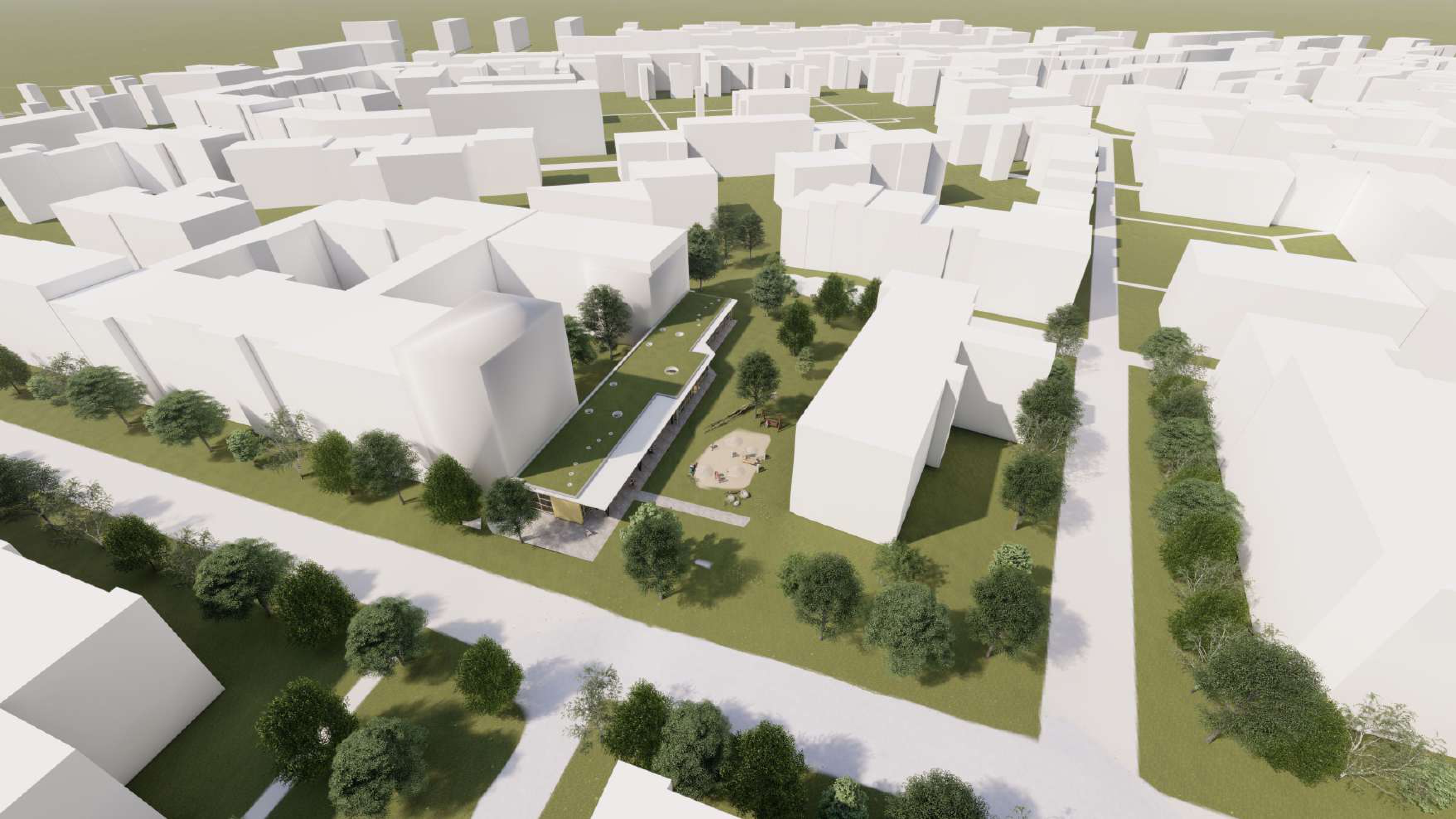 This concept describes a sustainable space designed to foster playful learning and creativity in children.