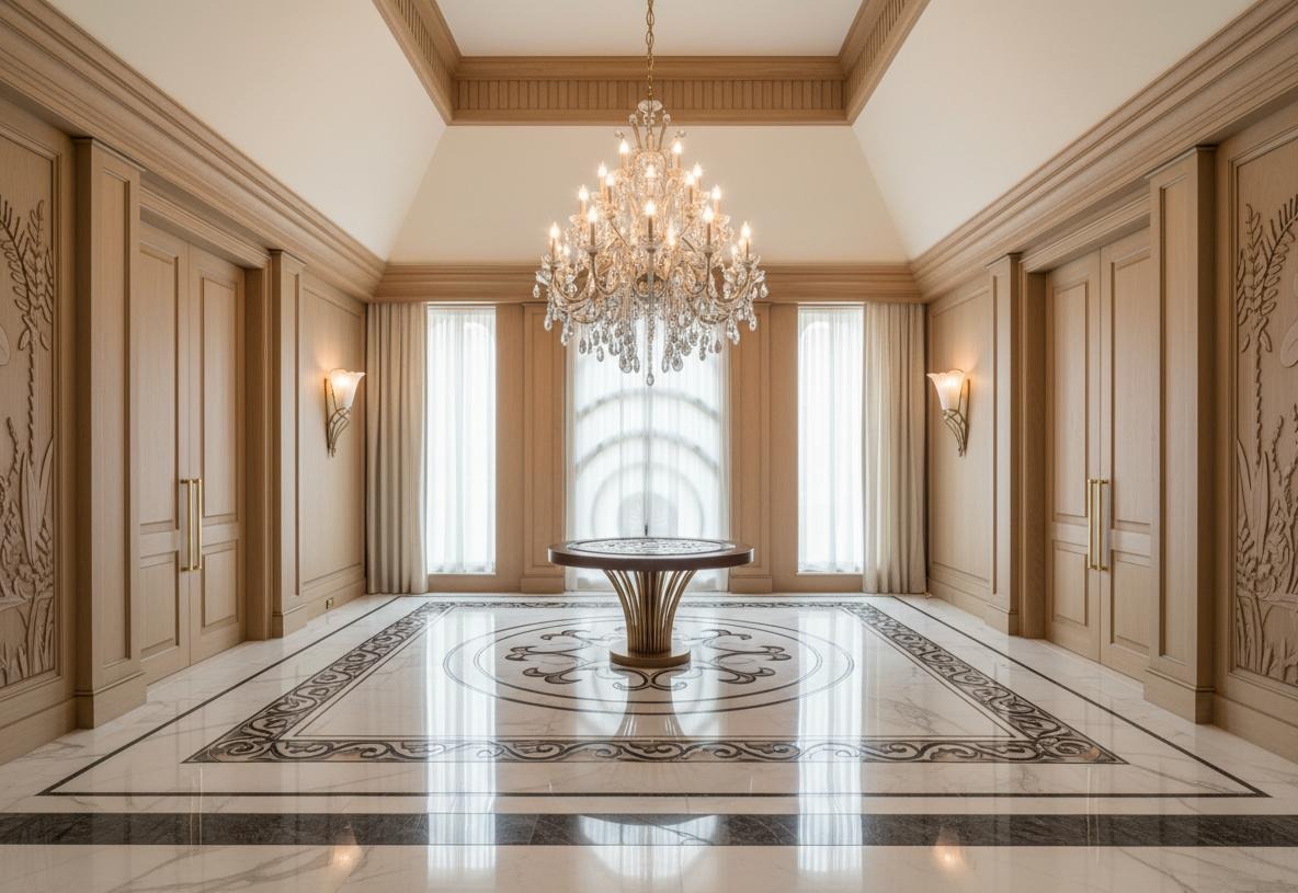 The lobby acts as a graceful transition into the majesty, setting the tone through balanced proportions, subtle lighting, and luxurious finishes. Together, both spaces form a cohesive experience—where tradition, formality, and sophistication meet in perfect harmony.
